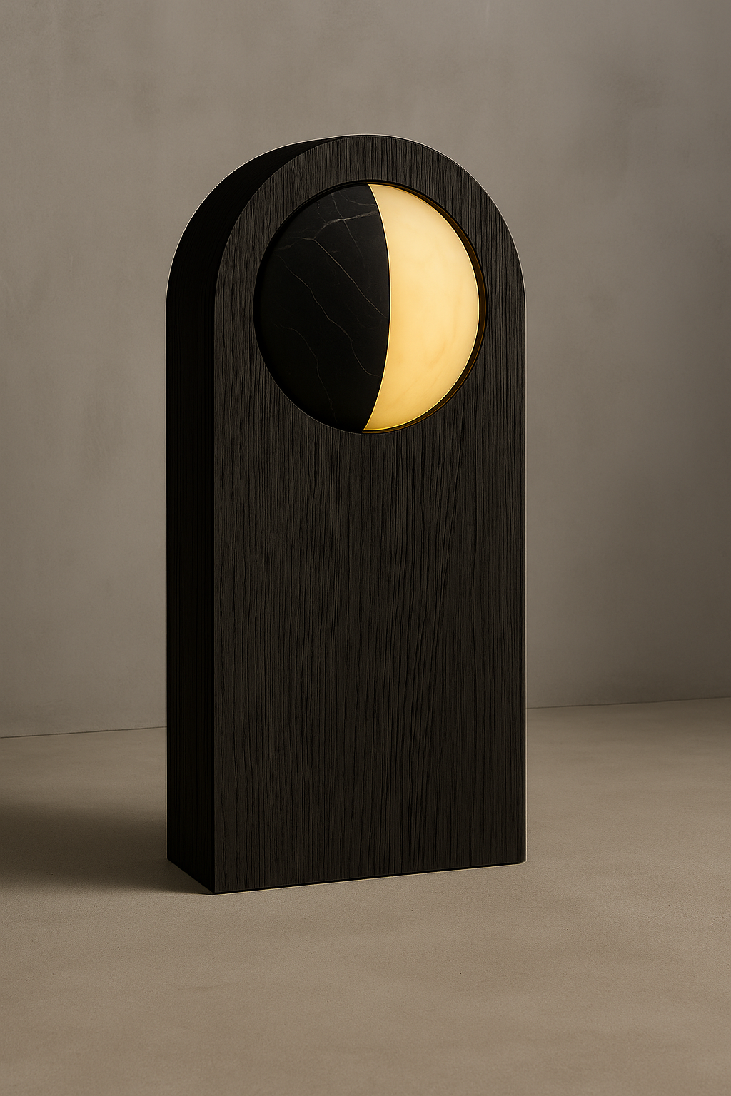 MATERIALS: A half-sphere of black marble forms the shadowed side of the moon, paired with a half-sphere of alabaster that reveals the shifting phases. The split stone sphere rotates on a 29.5-day cycle, mirroring the moon’s orbit around Earth, and is set within a frame of blackened wood or steel.
